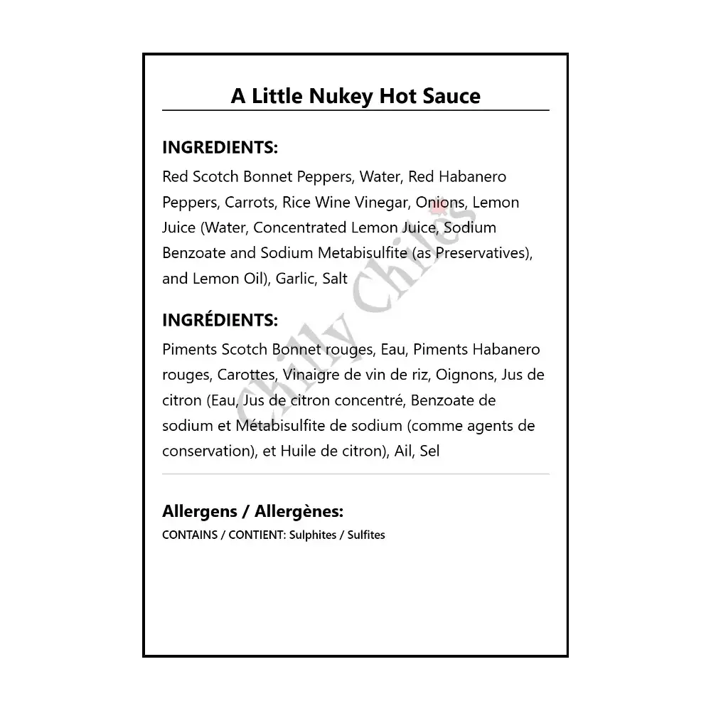 Ingredients: Red Scotch Bonnet peppers, water, Red Habanero peppers, carrots, rice wine vinegar, onions, lemon juice (water, concentrated lemon juice, Sodium Benzoate, Sodium Metabisulfite (as preservatives), lemon oil), garlic, salt