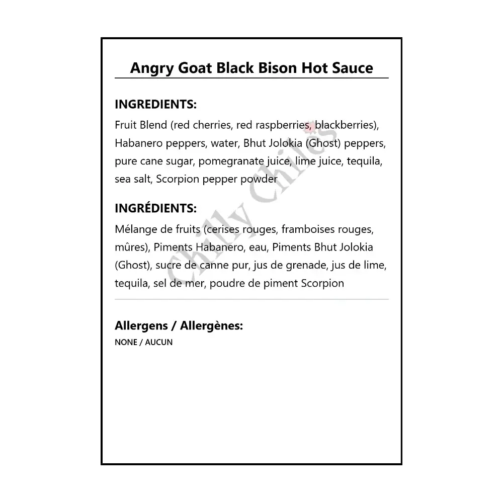 Ingredients: Fruit Blend (red cherries, red raspberries, blackberries), Habanero peppers, water, Bhut Jolokia (Ghost) peppers, pure cane sugar, pomegranate juice, lime juice, tequila, sea salt, Scorpion pepper powder. 148 ml