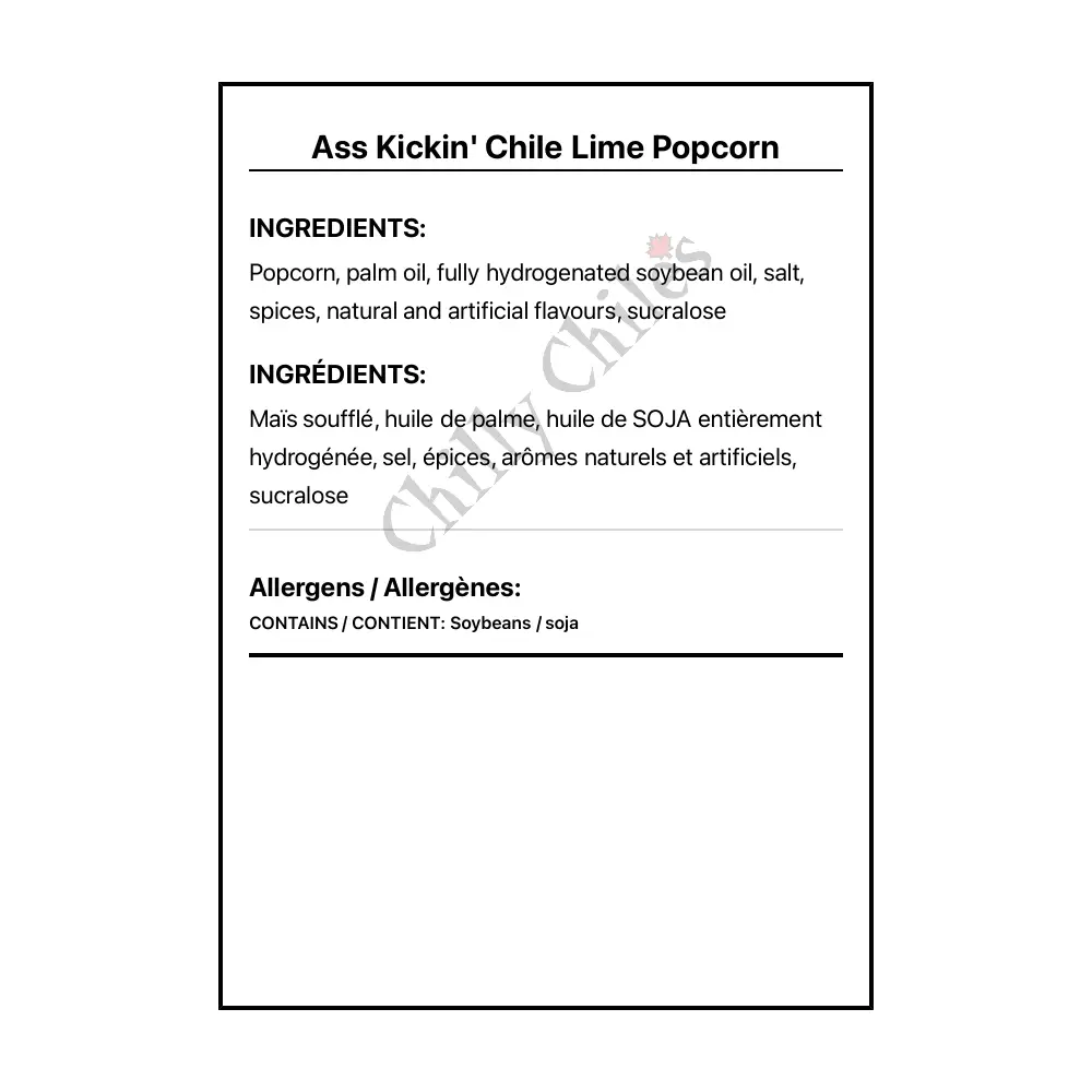 Ingredients: Popcorn, palm oil, fully hydrogenated soybean oil, salt, spices, natural and artificial flavours, sucralose.