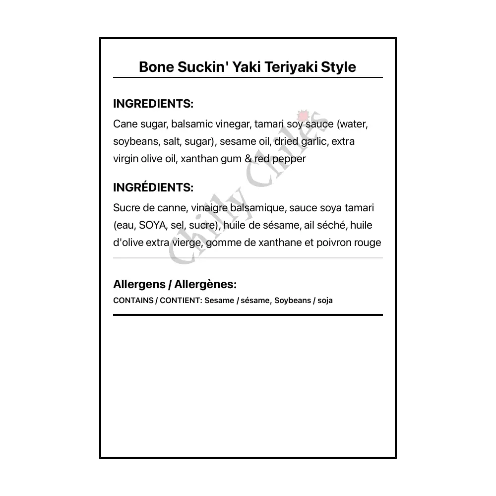 With an organic cane juice base, this sauce is lower in sodium than traditional teriyaki and loaded with flavor. A subtle hint of garlic combines Italian balsamic vinegar, soy sauce and sesame oil to bring all the great taste you've come to expect from Bone Suckin' Sauce, with an Asian flair!
