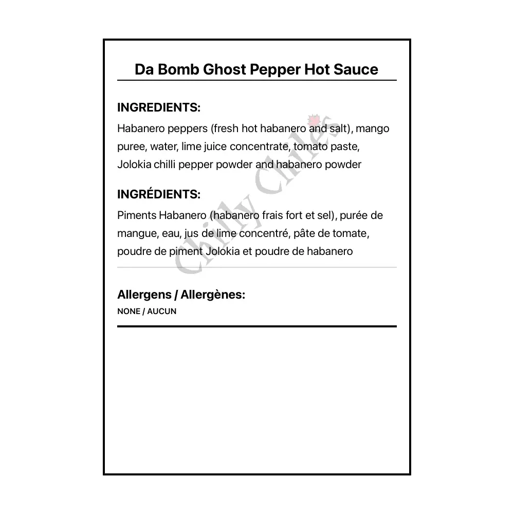 Ingredients: Habanero peppers (fresh hot habanero and salt), mango puree, water, lime juice concentrate, tomato paste, Jolokia chilli pepper powder and habanero powder.