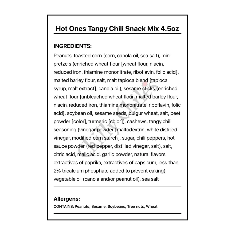 Ingredients: Peanuts, toasted corn (corn, canola oil, sea salt), mini pretzels (enriched wheat flour [wheat flour, niacin, reduced iron, thiamine mononitrate, riboflavin, folic acid], malted barley flour, salt, malt tapioca blend [tapioca syrup, malt extract], canola oil), sesame sticks (enriched wheat flour [unbleached wheat flour, malted barley flour, niacin, reduced iron, thiamine mononitrate, riboflavin, folic acid], soybean oil, sesame seeds, bulgur wheat, salt, beet powder [color], turmeric [color]), cashews, tangy chili seasoning (vinegar powder [maltodextrin, white distilled vinegar, modified corn starch], sugar, chili peppers, hot sauce powder (red pepper, distilled vinegar, salt), salt, citric acid, malic acid, garlic powder, natural flavors, extractives of paprika, extractives of capsicum, less than 2% tricalcium phosphate added to prevent caking), vegetable oil (canola and/or peanut oil), sea salt.