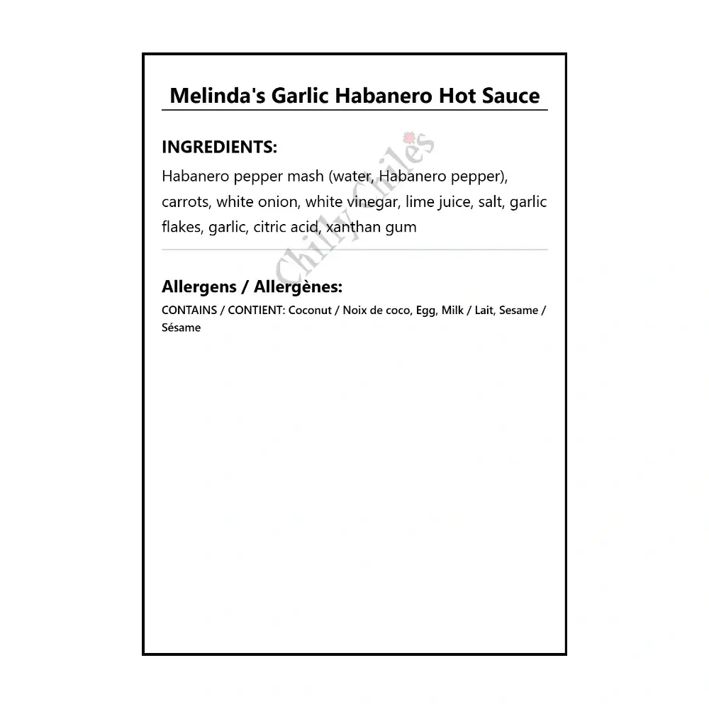 Ingredients: Habanero pepper mash (water, Habanero peppers), carrots, onion, vinegar, lime juice, garlic, salt, citric acid, xanthan gum. May contain traces of tree nuts (coconut), egg, soybeans, wheat, milk.