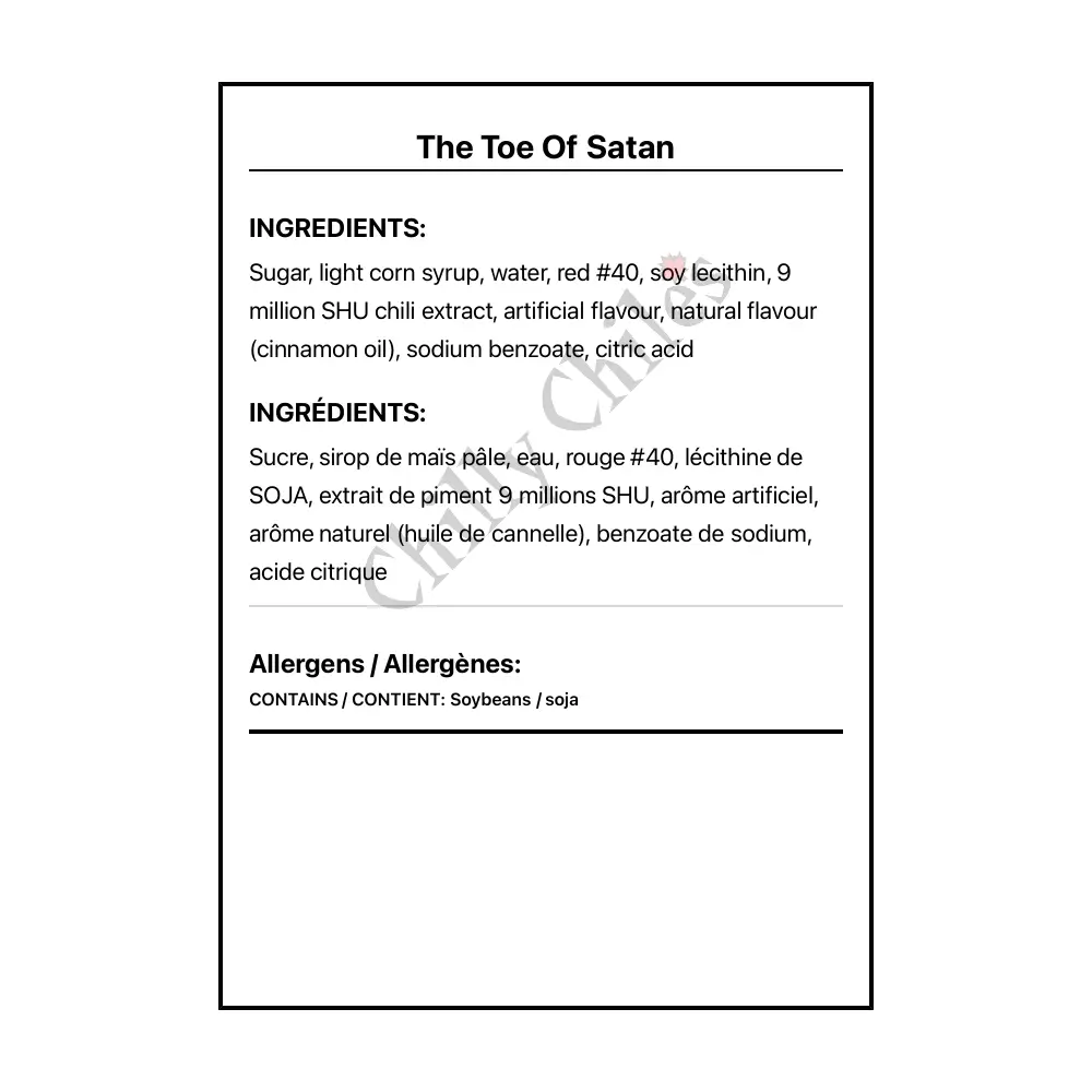 Ingredients: Sugar, light corn syrup, water, red #40, soy lecithin, 9 million SHU chili extract, artificial flavour, natural flavour (cinnamon oil), sodium benzoate, citric acid. 20 g